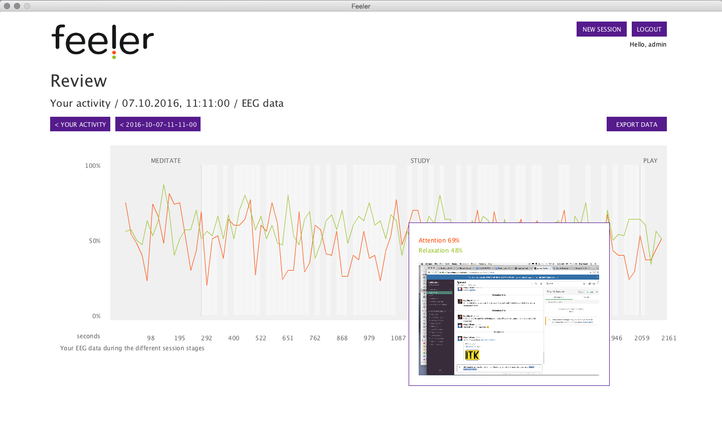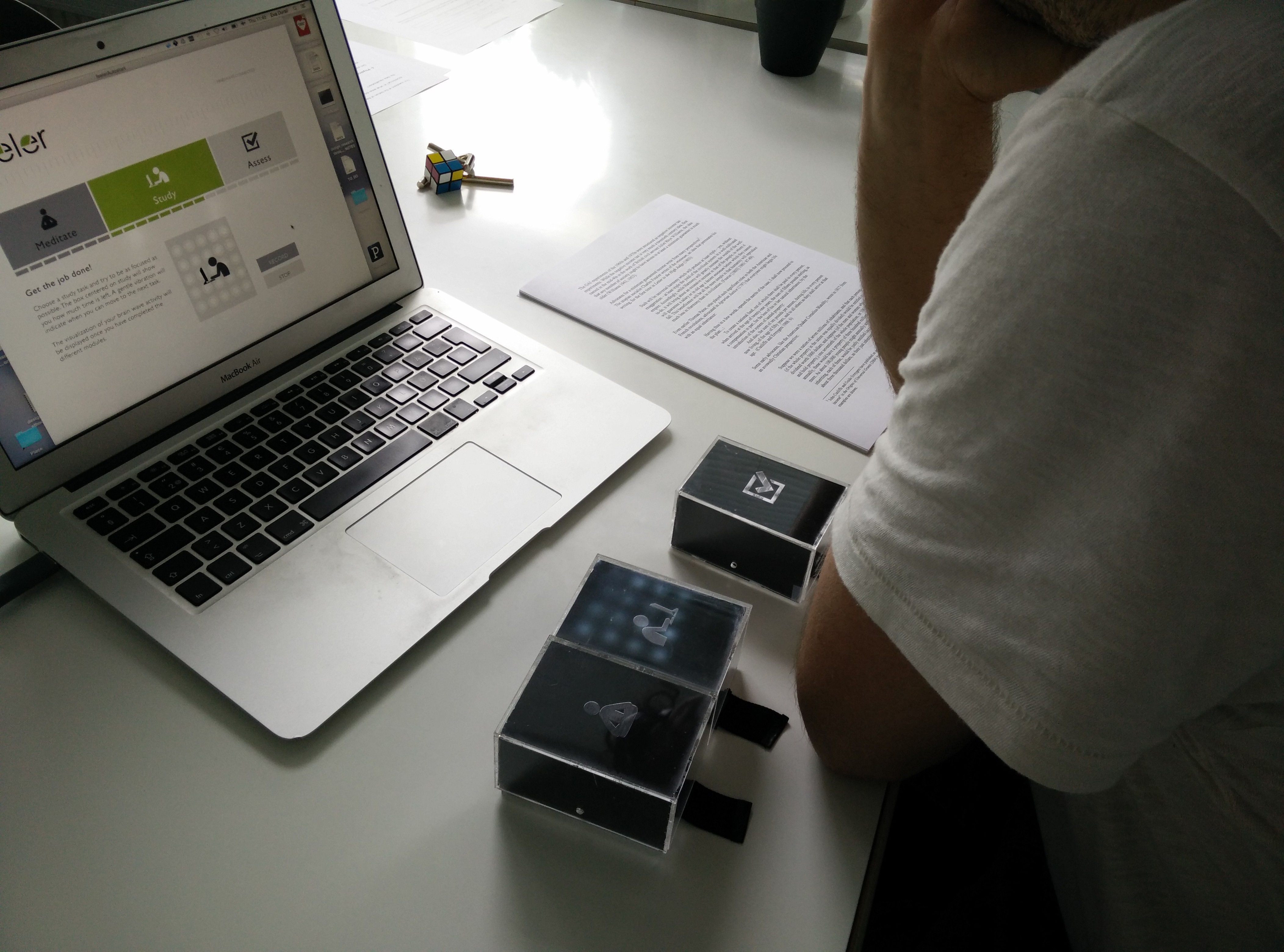 Feeler consists of a desktop app and three guide boxes that communicate with an EEG headset. Use Feeler desktop app to start recording data. Each Feeler box is dedicated to a specific activity (meditation, study and play) and will guide you through different types of feedback. Once a session has been completed, you can review your data on the desktop app.