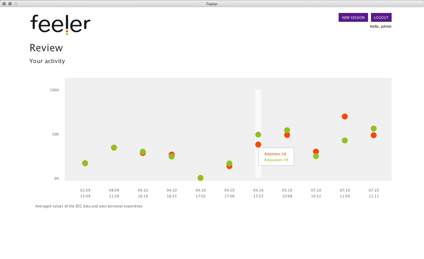 How well do you know yourself? The Feeler app visual dashboard contrasts the data captured automatically with your personal impressions. At the end of each Feeler study session you can compare how attentive and relaxed you felt with the attention and relaxation levels captured by the EEG device. Feeler doesn’t give advice nor tell what’s right or wrong about the collected data. Instead, it aims to help you know yourself and gain awareness about how your mental states affect your ability to learn.