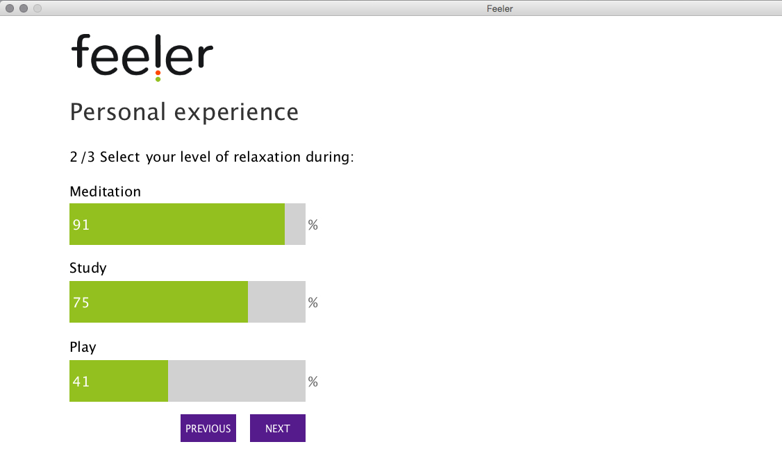Feeler asks you to follow a specific script of activities. This allows you to compare how attentive and relaxed you were when performing different tasks, but it also helps you to understand how different practices affect your mental states.